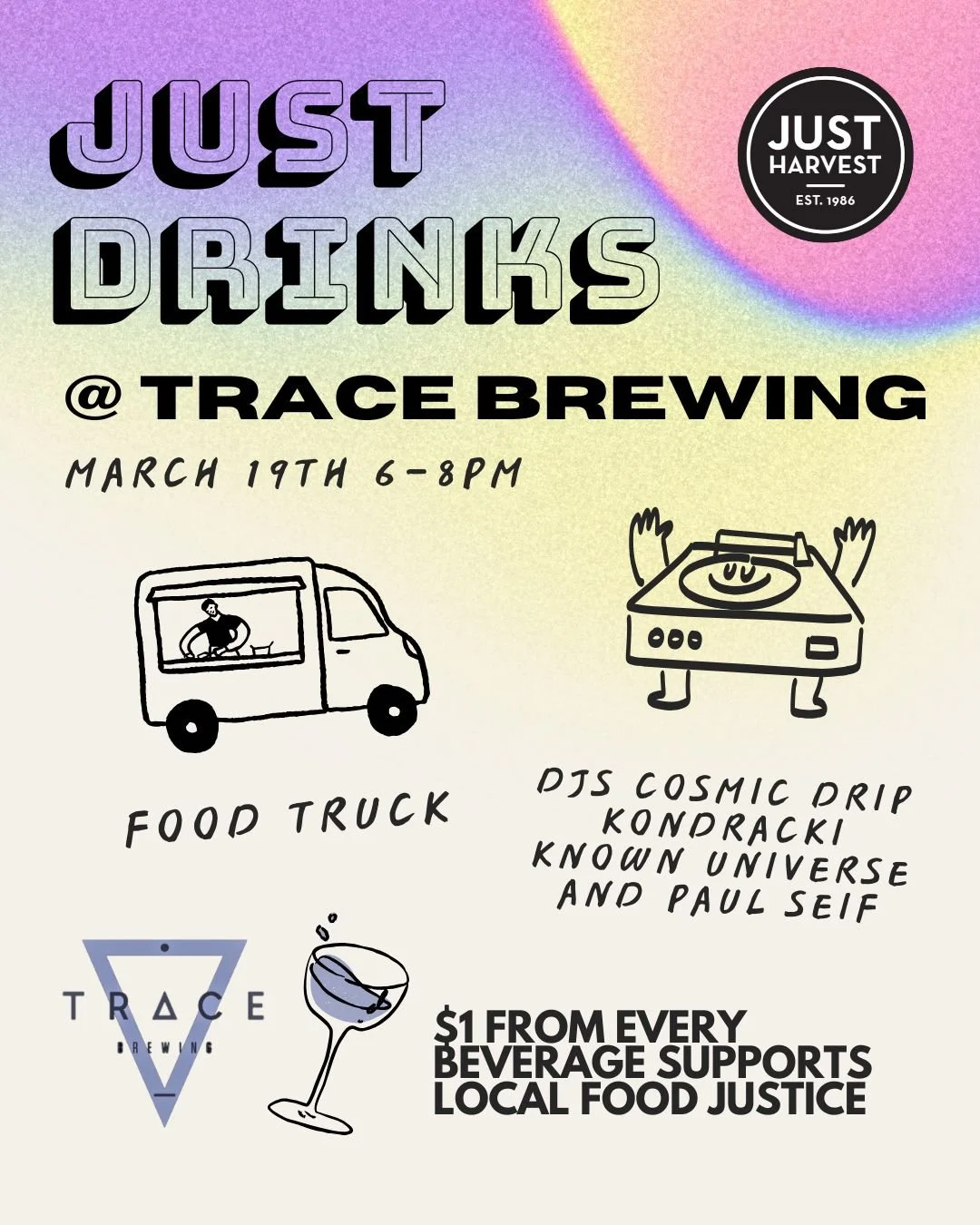 from 6-8 PM at Trace Brewing in Bloomfield for a fun evening where $1 from each drink benefits Just Harvest!