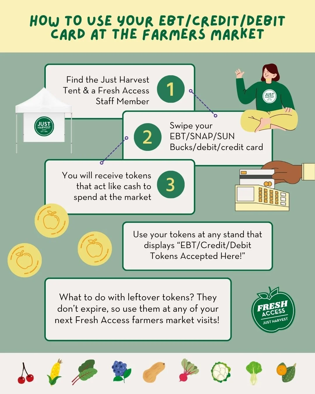 At Just Harvest’s red market tent or at the market manager’s tent (just look for Fresh Access signs!), shoppers can swipe their electronic benefits transfer (EBT/SNAP/SUN Bucks) cards or their credit or debit cards. They will then receive tokens they can use just like cash to purchase a variety of fresh produce, baked goods, meat, and dairy products.