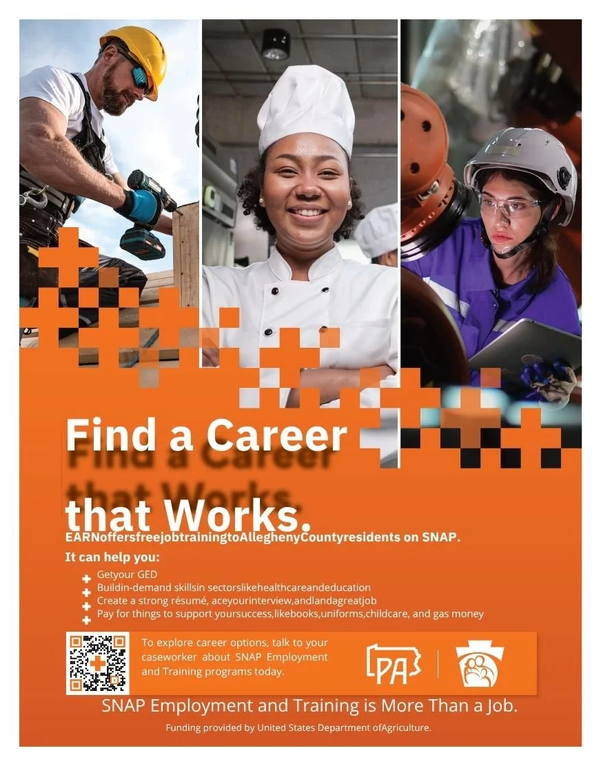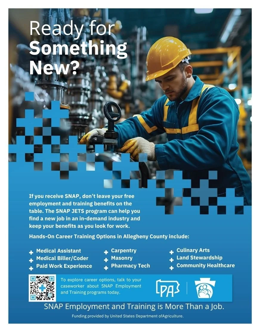 • SNAP Job Experience & Training Services (JETS): Learn a specific trade or skill. All programs are free, and some provide stipends or pay while you train. Current programs include Bidwell Training CenterCenter for Employment OpportunitiesCommunity Kitchen Pittsburgh, Landforce, and Trade Institute of Pittsburgh