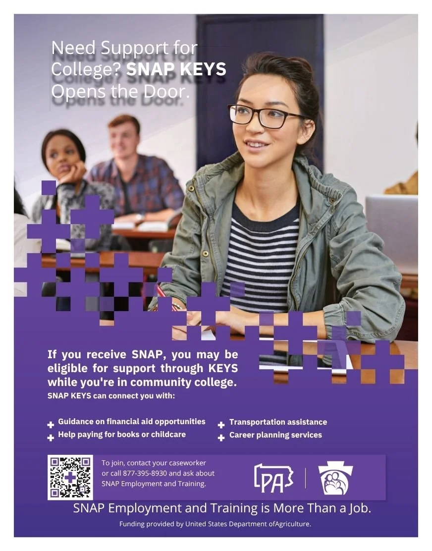 • KEYS - Keystone Education Yields Success (KEYS) provides community college students with support in navigating financial aid, careers, and support with costs like books, child care, transportation, hygiene items, and more.